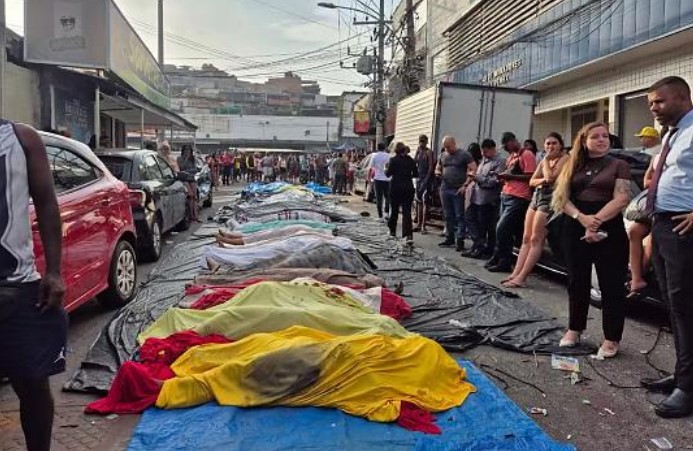Moradores do Complexo da Penha, na Zona Norte do Rio de Janeiro, levaram pelo menos 55 corpos para a Praça São Lucas, na Estrada José Rucas, uma das principais da região, ao longo da madrugada desta quarta-feira (29), o dia seguinte à operação mais letal da história do RJ.